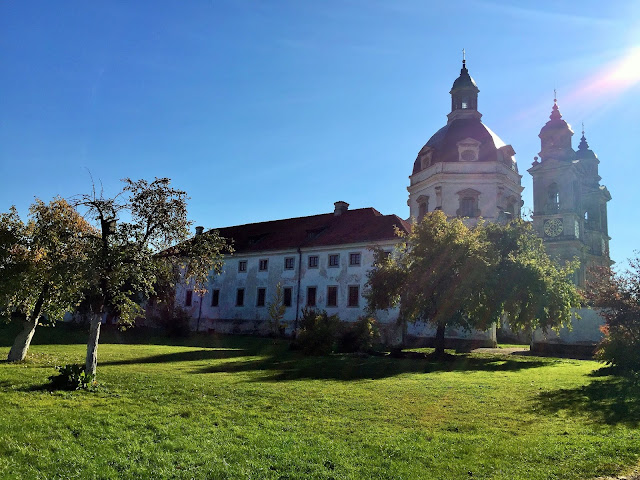 网上查閱資料說帕塞斯利斯(Pažaislis)修道院是立陶宛最大的修道院,也是立陶宛最大的義大利巴洛克式建築,始建於1662年,是一座修道院与教堂的複合體。我們在草坪上玩了一會,就決定去修道院參觀,順便找洗手間。早上坐电车來時,下車也沒找到公廁,公车總站那裡只有一座简易廁格,看來为方便公车司機,沒考慮乘客需求。也难怪的,這個地方人口少,廁所也就少!