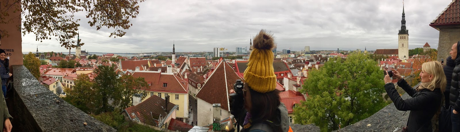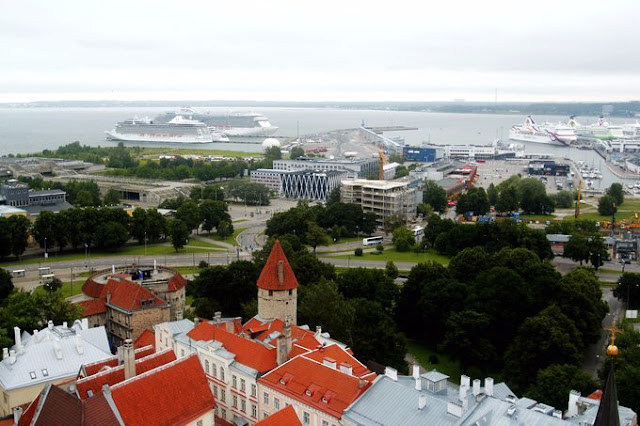 爬上山來,因為有三個观景台需要转,先去了一個观景台,景觀很普通,面對山林。 口圖觀景台 Kohtu Vaateplatvormid,就非常漂亮,面向大海,又可观看古城美景,用望遠鏡看,还可把塔林碼頭看得一清二楚。