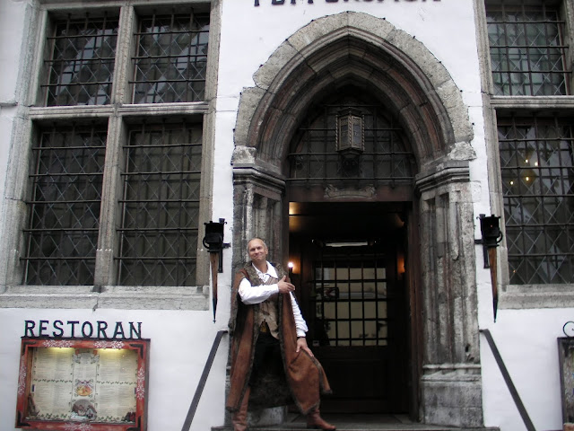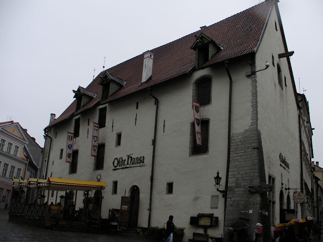 在一尊銅像背後有道小門,連結下山的石板路短腿街(Luhike jalg),沿坡走下去可到達塔林下城,即市政廳廣場周邊一帶。逛了一大早,还沒到中午就尿急的我,在廣場轉一圈都找不到WC标志,妹妹说食侍裡面一定有,我們剛好走到著名的Old Hansa餐廳門口,並不打算进去用餐,说是餐費價格不菲,我傻乎乎冲进去找廁所,可裡面光线昏暗,根本找不着洗手間,唯有詢問卖手工艺品櫃台前、穿著中世紀服裝的漂亮姑娘,她回答我说,这裡周圍都係商铺,沒有WC!我只好悻悻走出門。后來想想,是自己不懂说英文借用一下洗手間吧,不過即使说了,她也有可能說洗手间不外借。