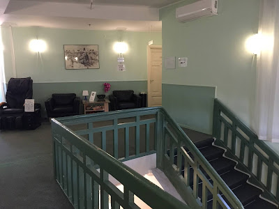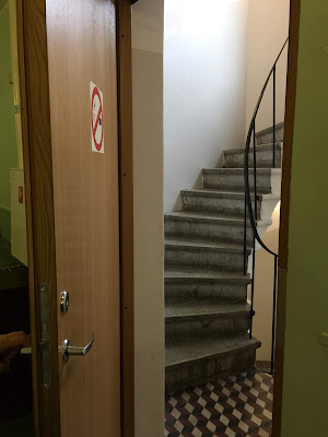 一座木造建築的楼房,沒有电梯,得自個拔行李箱上楼,如果不幸住三樓的話,就得再爬旋轉樓梯上去。我住在二樓,每每有人行走走廊,踩著木地板發出的聲響十分鬼魅,仿佛在我房門口來回走動着!