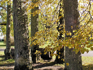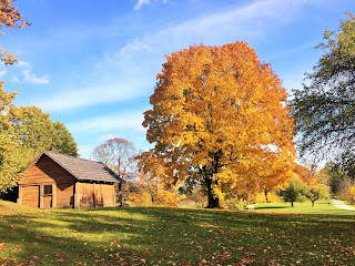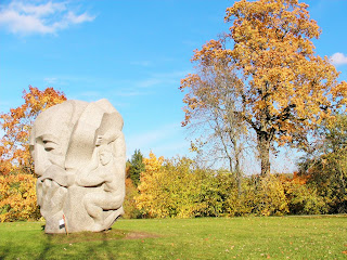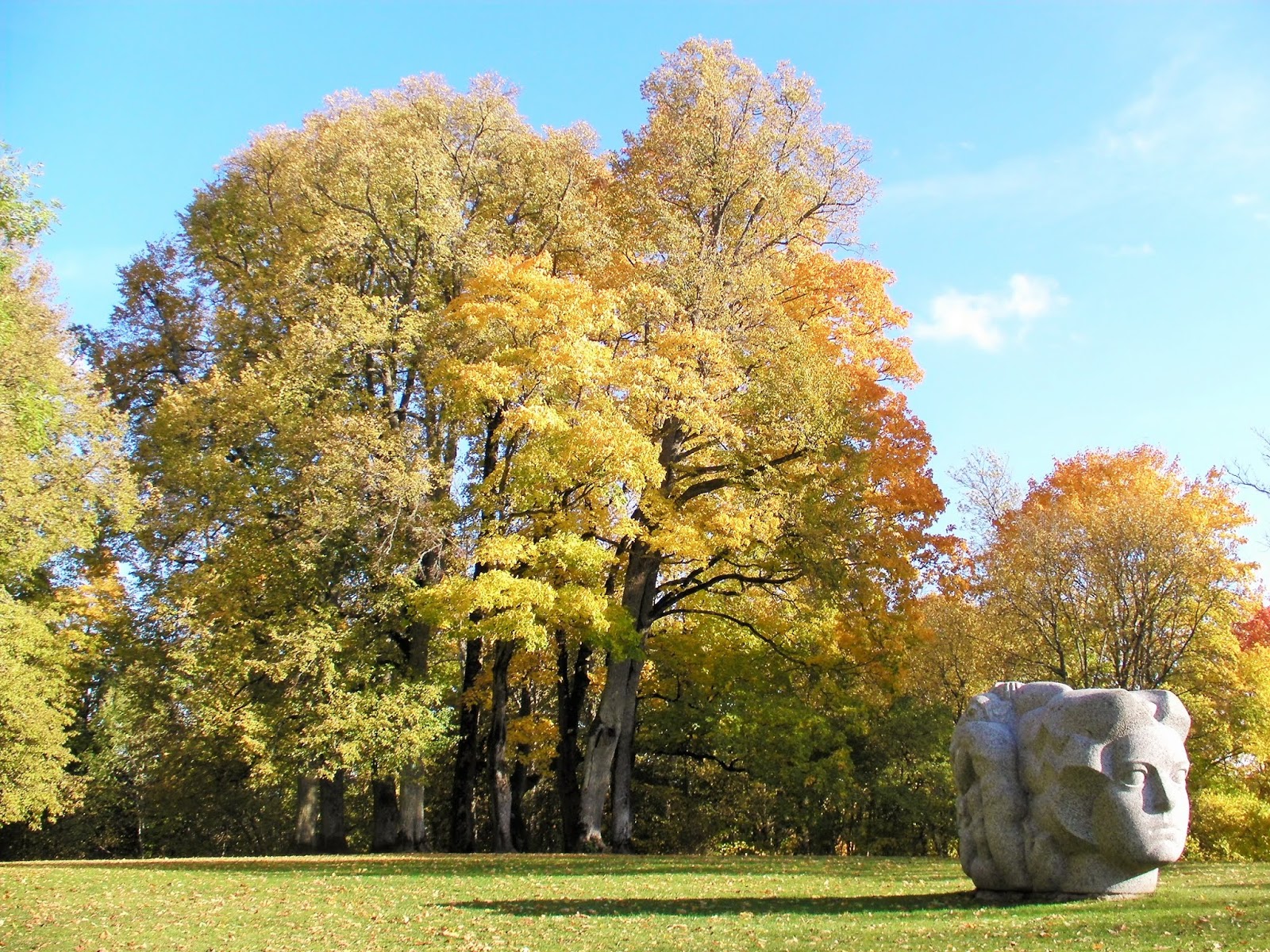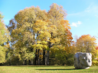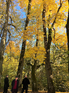 在这塊雕像背后是树木丛林,当中有三幾株醒目吸睛的黃金枫树,我徐徐走近时,有两位男士也朝枫树丛林靠近,年长的那位 先生边走边向年輕人介紹着什么,然后站在大树下眉飞色舞地讲起故事来,惹来另一位高高瘦瘦的大叔湊近听讲。